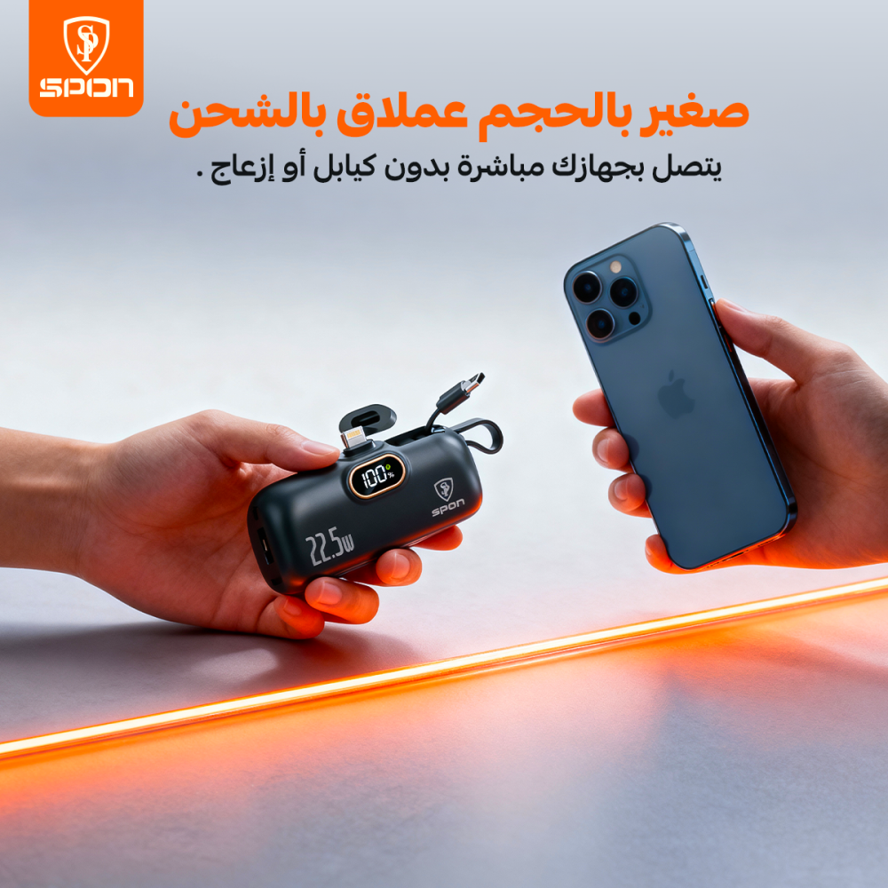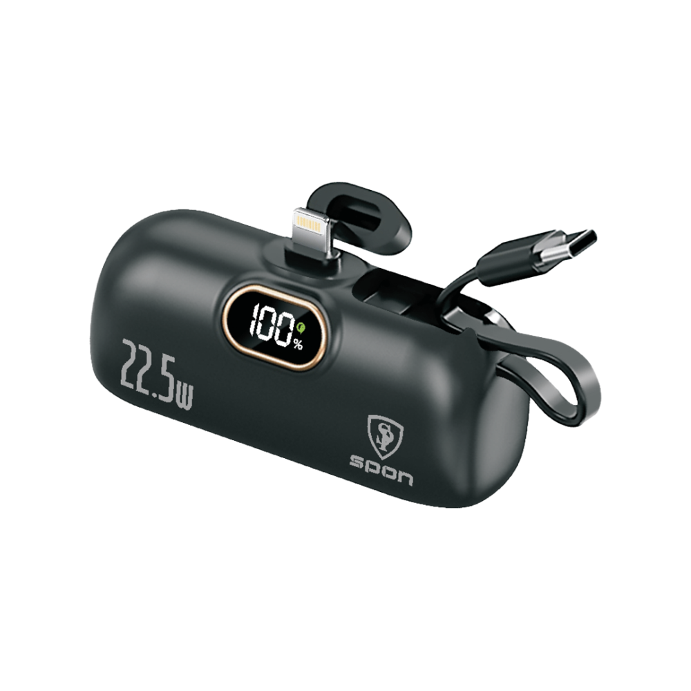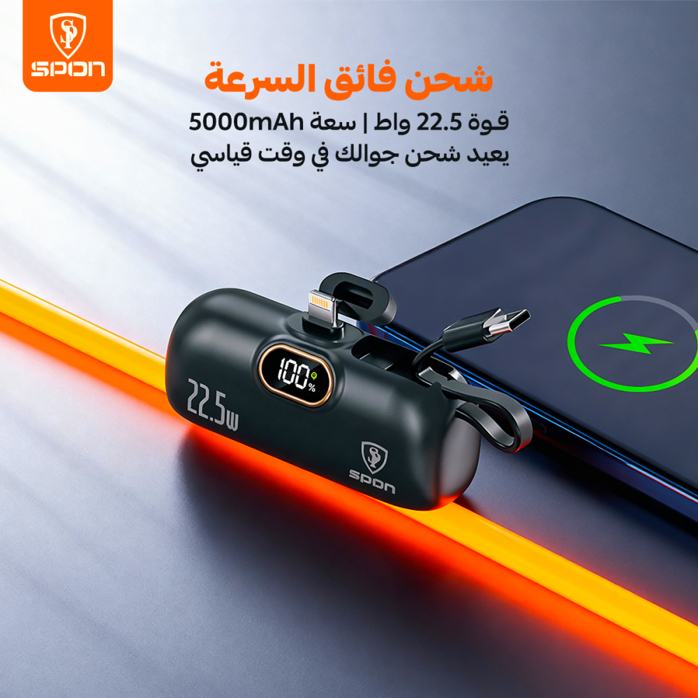 الحل الأمثل للطاقة الفورية في تصميم متناهي الصغر، تقدم لك شركة Spon هذا الباور بانك "الميني" بسعة 5000 مللي أمبير. يتميز بقدرة شحن فائقة تصل إلى 22.5 واط وتصميم يغنيك عن حمل الكابلات الطويلة، حيث يتصل بجهازك مباشرة ليمنحك شحناً سريعاً وأنيقاً في أي وقت.