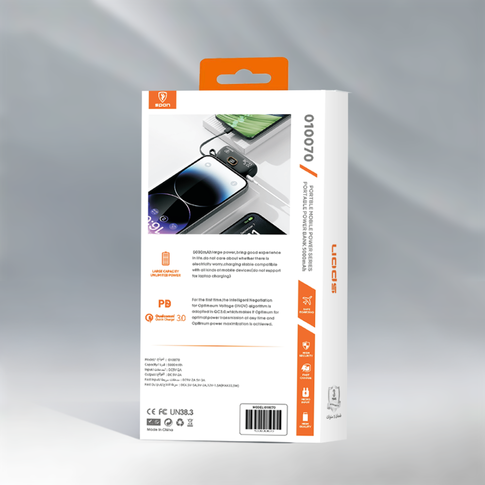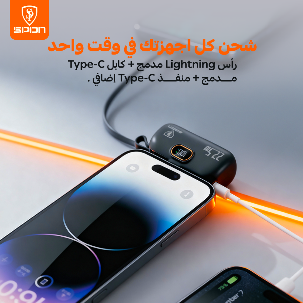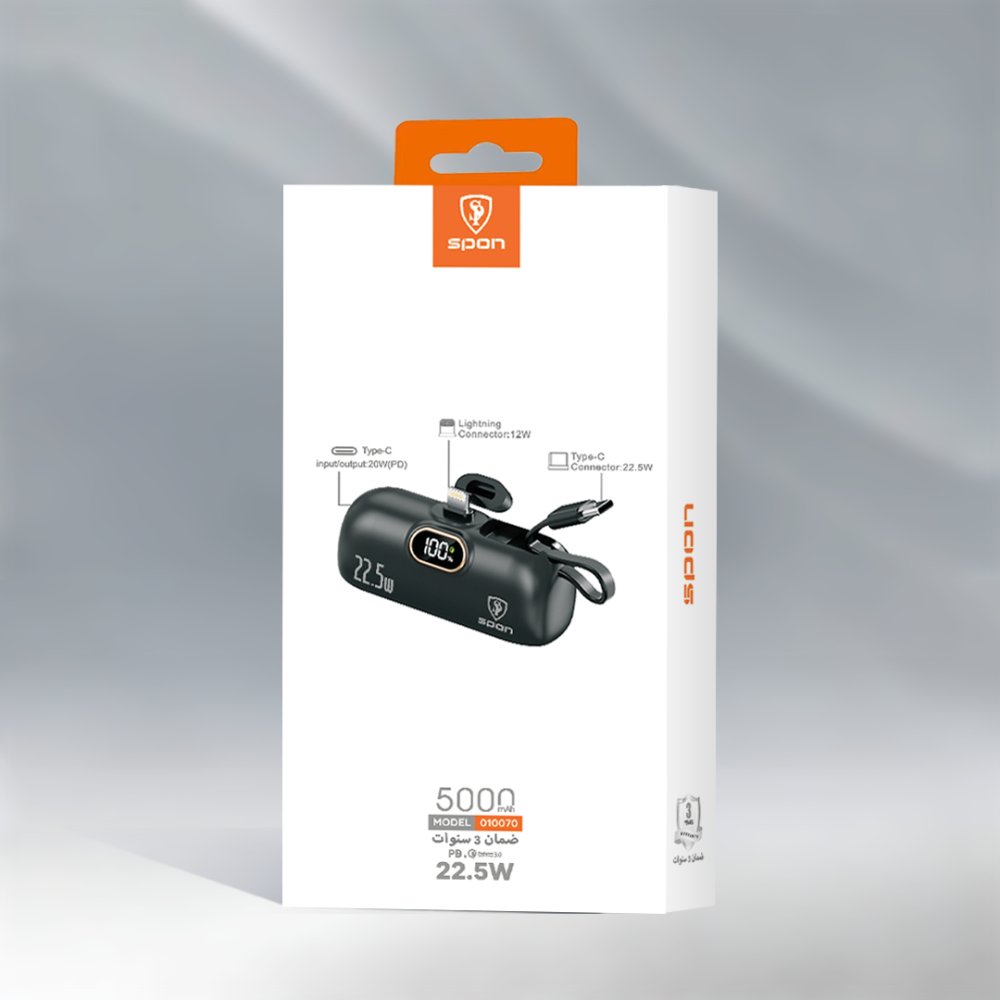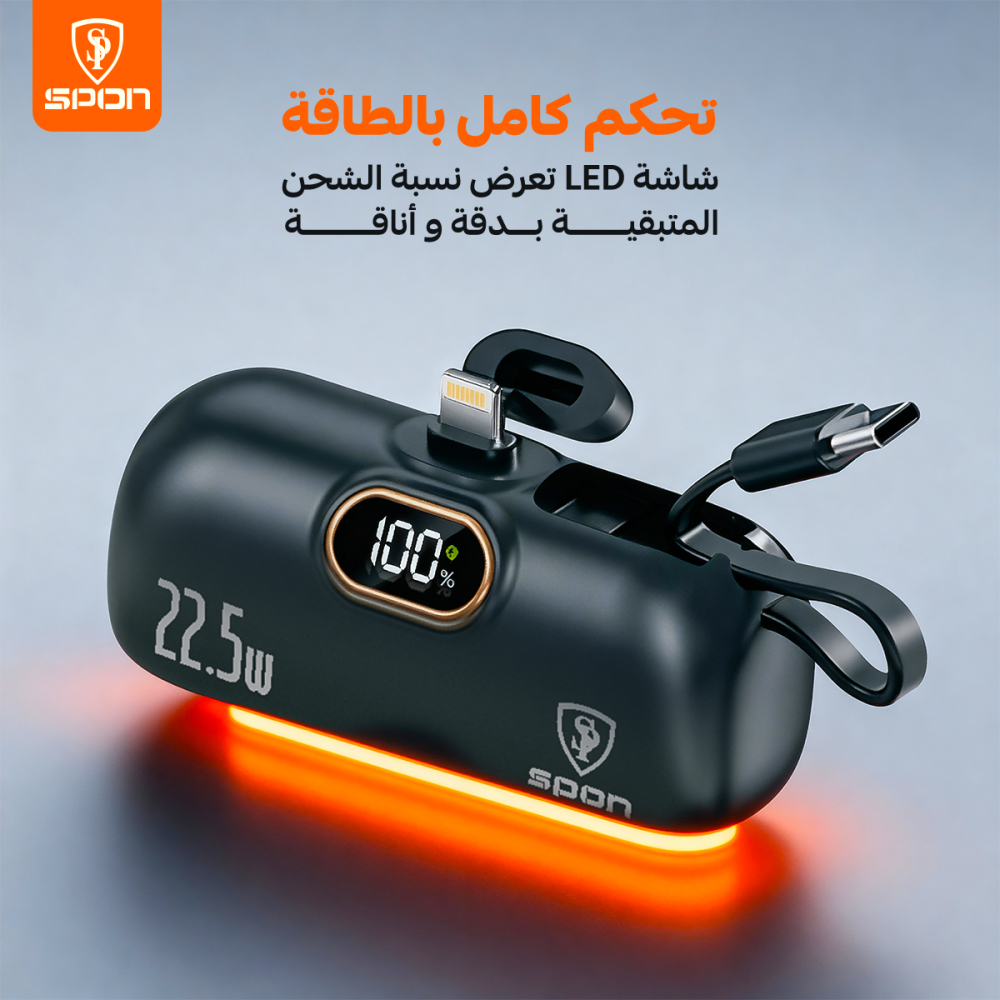 الحل الأمثل للطاقة الفورية في تصميم متناهي الصغر، تقدم لك شركة Spon هذا الباور بانك "الميني" بسعة 5000 مللي أمبير. يتميز بقدرة شحن فائقة تصل إلى 22.5 واط وتصميم يغنيك عن حمل الكابلات الطويلة، حيث يتصل بجهازك مباشرة ليمنحك شحناً سريعاً وأنيقاً في أي وقت.