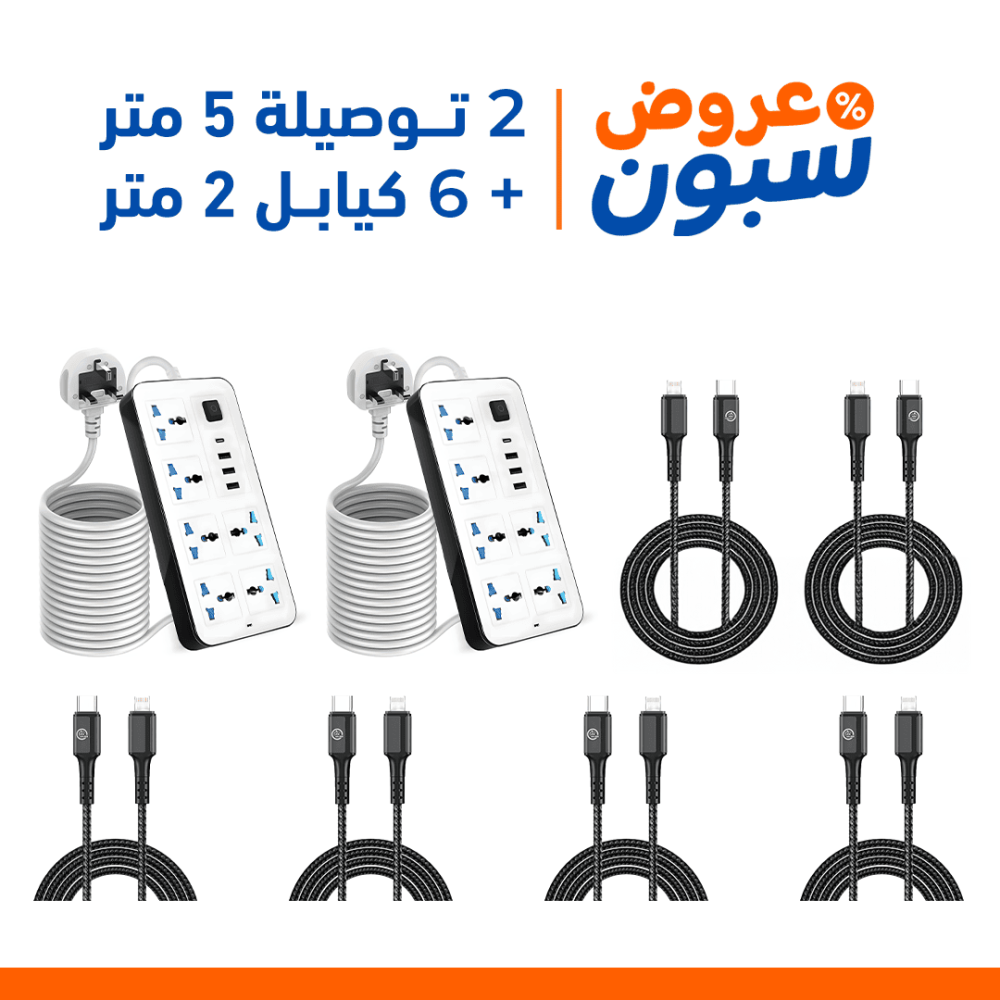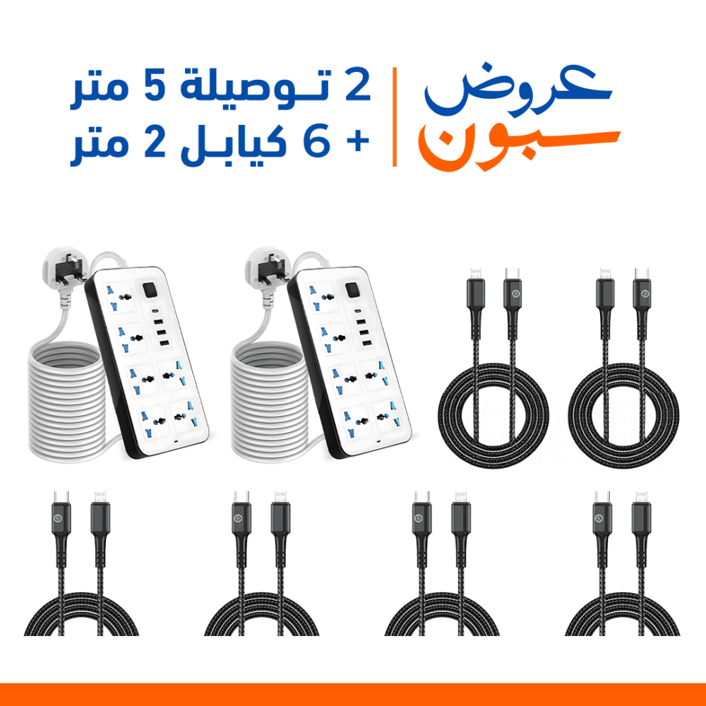 احصل على 2 توصيلة كهربائية 8 في 1 مع 6 كيبل قماش PD بطول 2 متر، لتشغيل أجهزتك وشحنها بسرعة وأمان في أي وقت. حل عملي للبيت والمكتب بقدرة عالية وجودة مضمونة مع ضمان سنتين.
