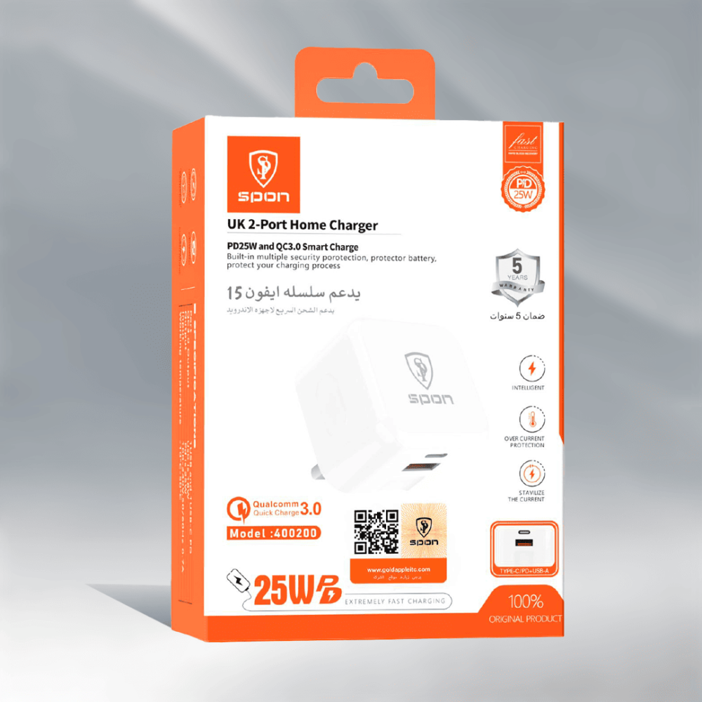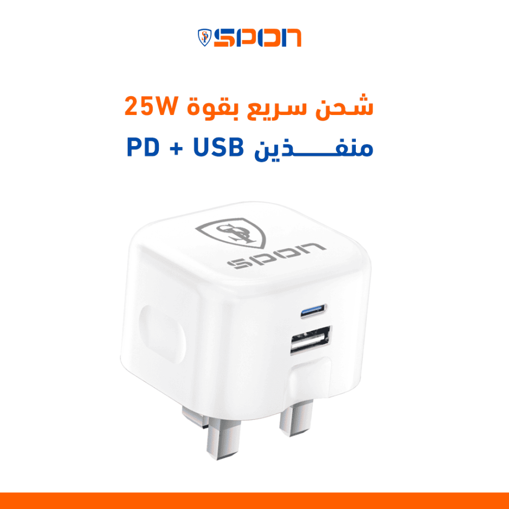 راس شاحن pd بقوة 25W ماركة SPON من أفضل شواحن جدارية ذات هيكل متين الذي يمنحك شحن سريع للجوال ،والمصنع من خامات عالية الجودة احصل عليه من spspon.