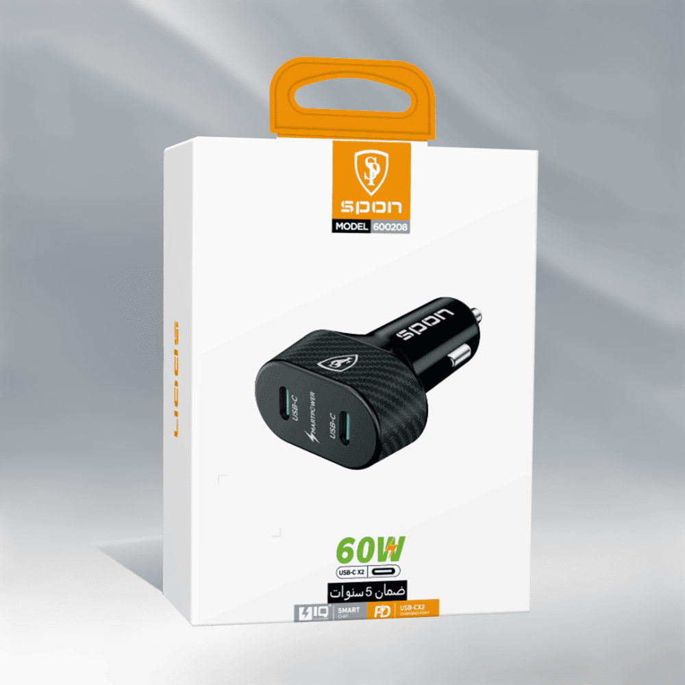 - اسم المنتج : شاحن سيارة سريع بقوة 60 واط بمنفذين شحن PD ماركة spon كاربون فايبر