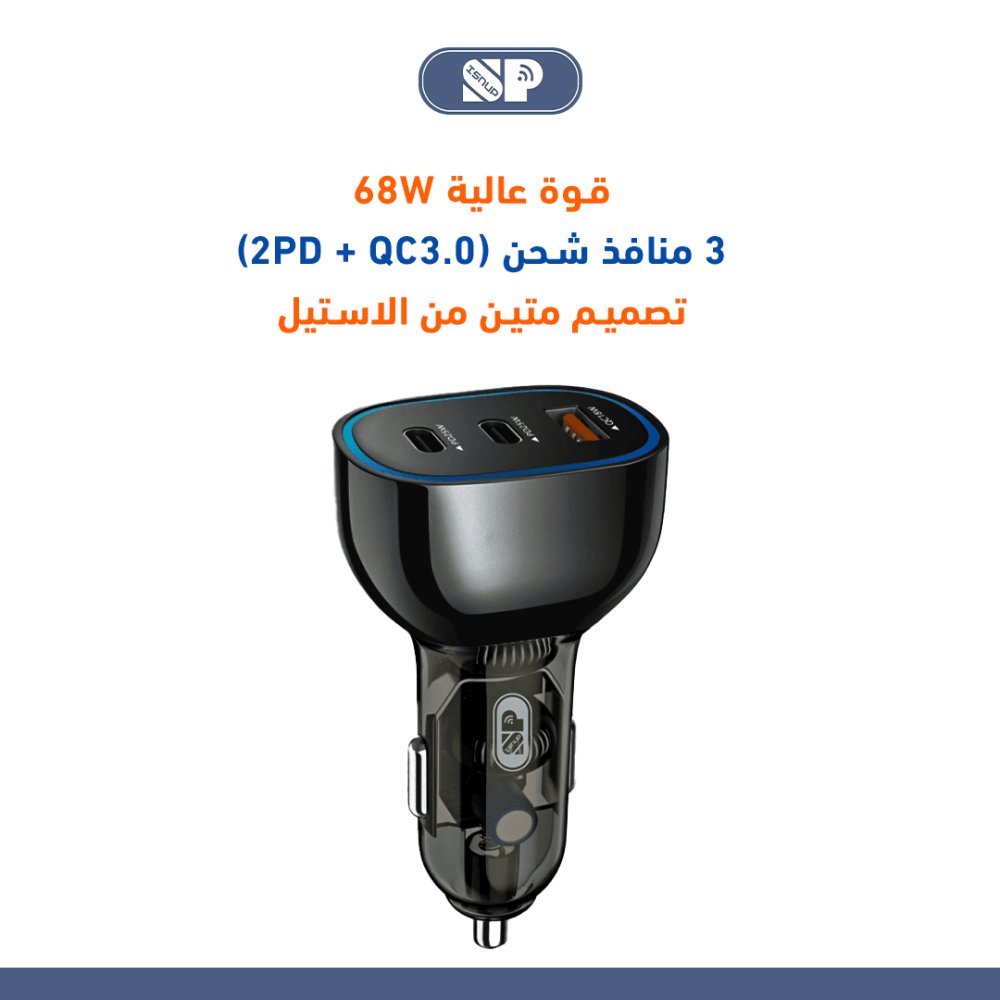 شاحن سيارة سريع بقوة 68 واط من العلامة التجارية ISNUP . يتميز هذا الشاحن بعدة خصائص منها: