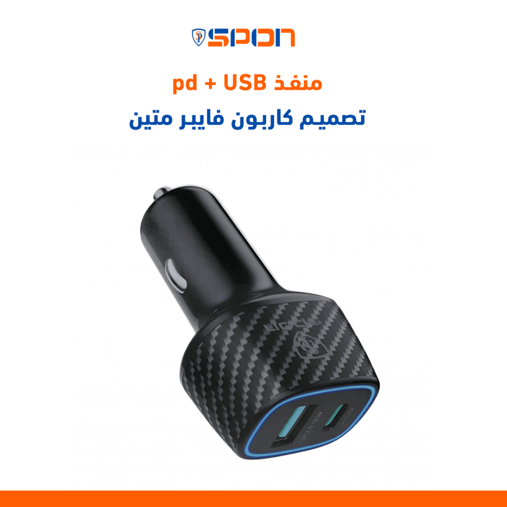 - اسم المنتج : شاحن سياره سريع بقوة 48 واط بمنفذين شحن PD + USB ماركة spon كاربون فايبر طراز SPN-CA519-01.