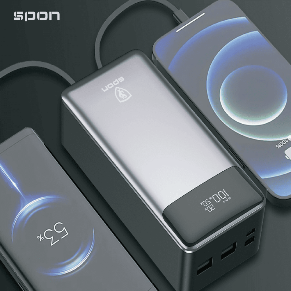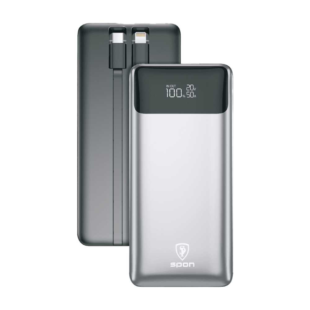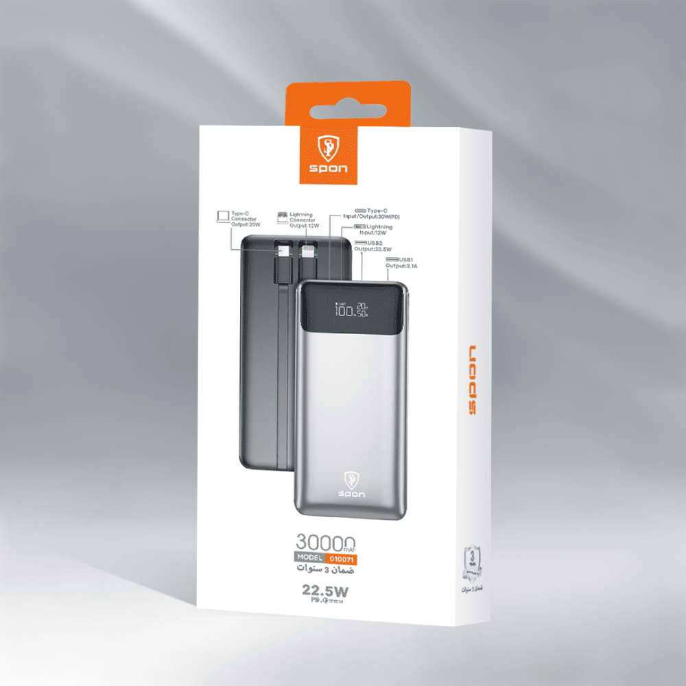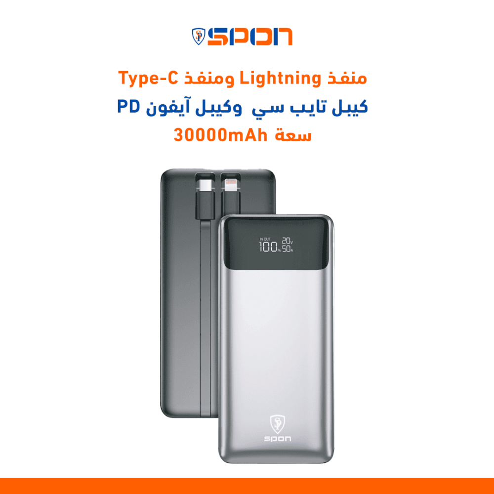 مميزات شاحن متنقل باور بانك 30000 مللي أمبير مع شاحن ايفون وتايب سي مدمج ماركة SPON .