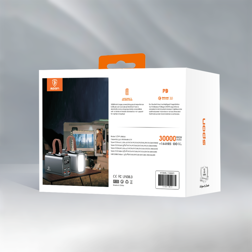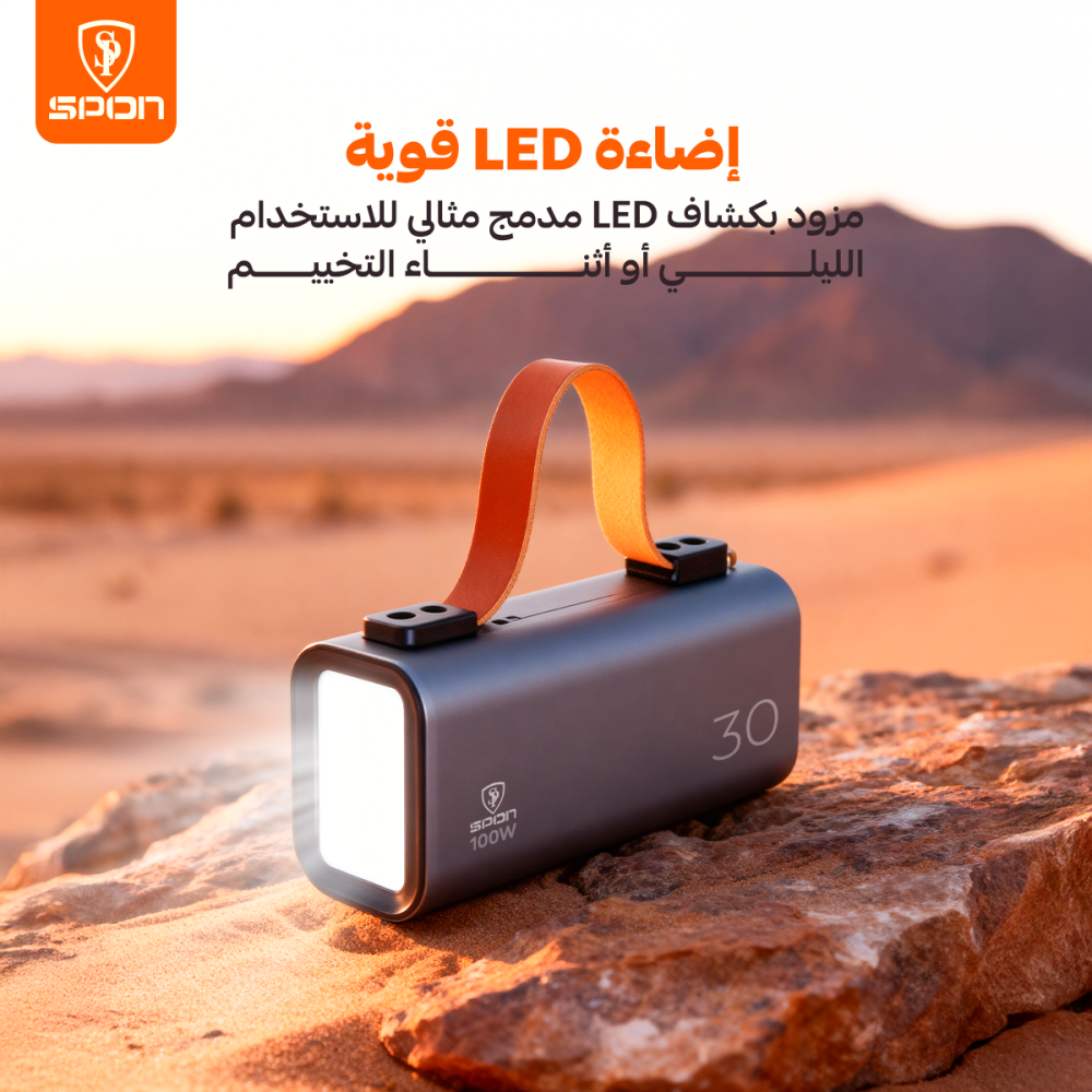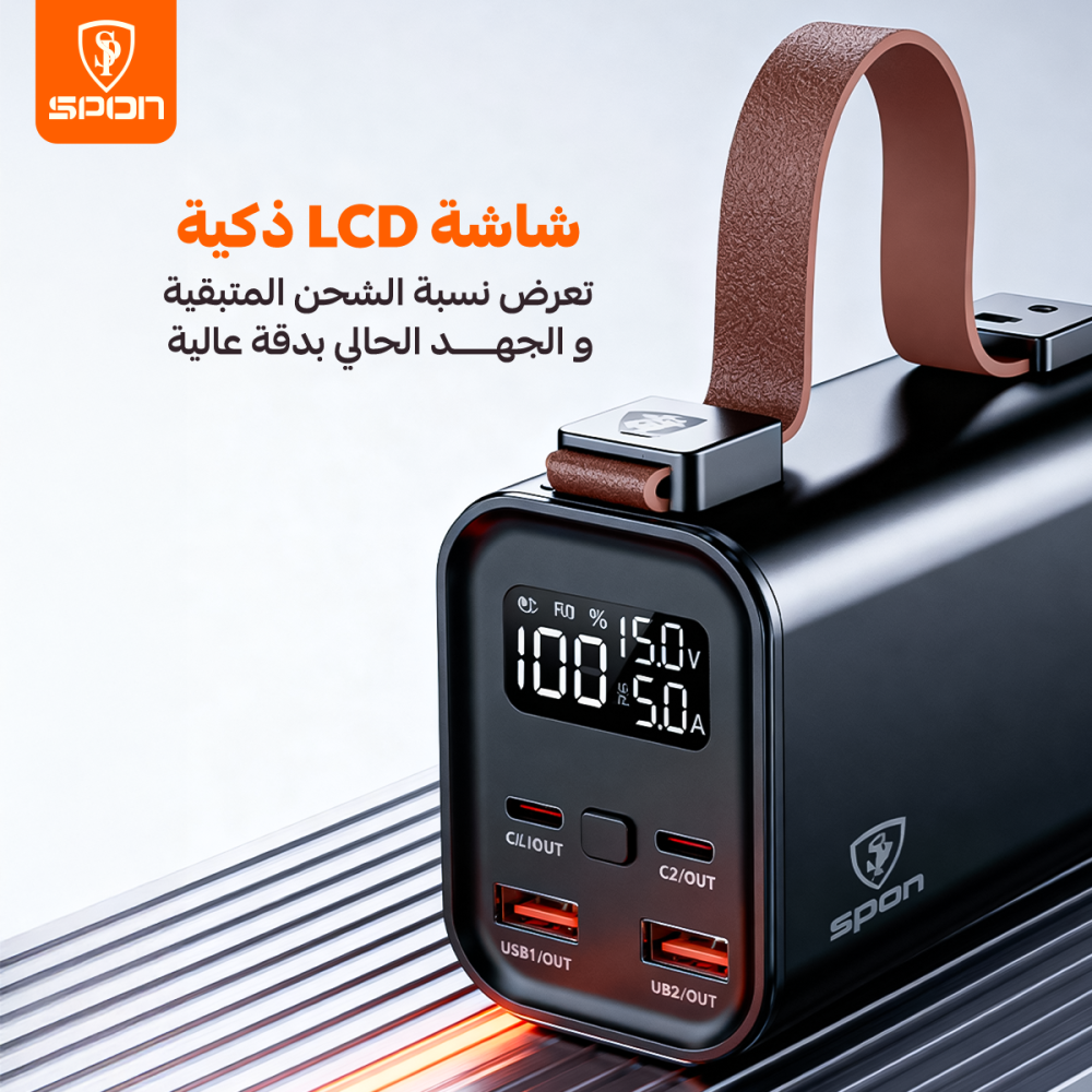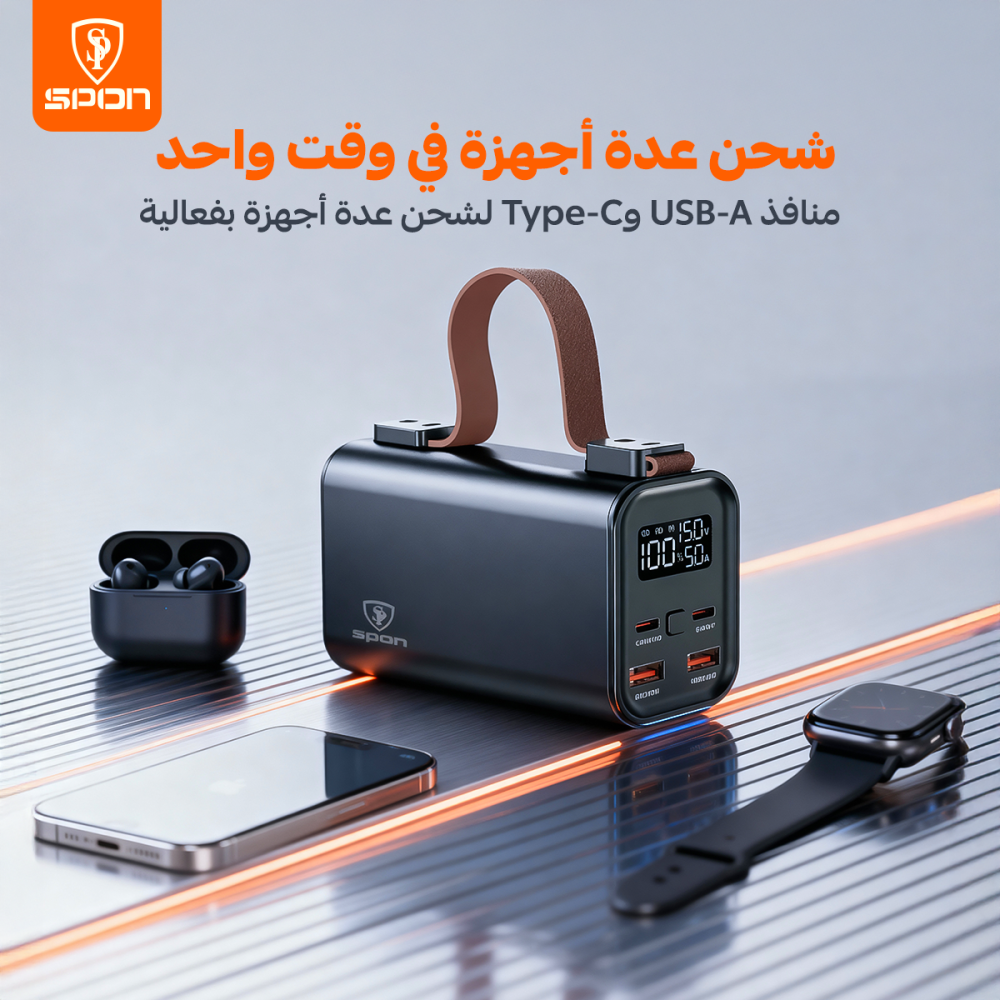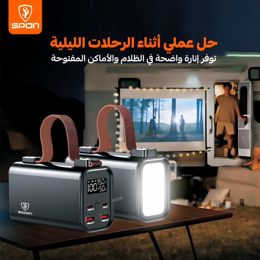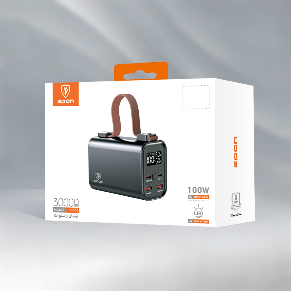 هذا المنتج عبارة عن (Power Bank) عالي السعة والأداء من علامة Spon التجارية. صُمم ليكون محطة طاقة متنقلة مثالية للرحلات الخارجية والتخييم، حيث يوفر طاقة هائلة لشحن الهواتف، الأجهزة اللوحية، وحتى أجهزة اللابتوب، مع تزويده بإضاءة LED قوية للاستخدام في الأماكن المظلمة.