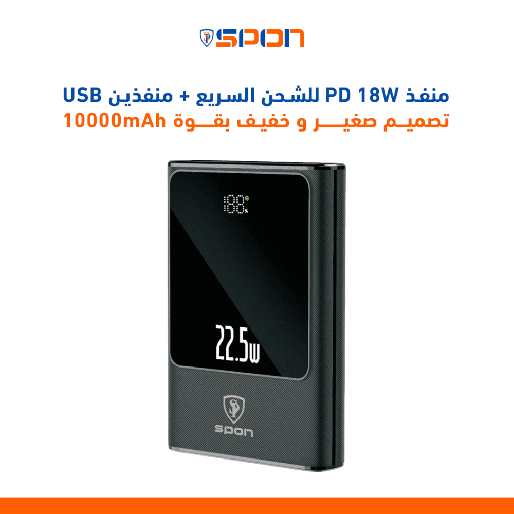 مواصفات باور بنك 10000 (منفذ PD 18W+منفذين USB) مع شاشة لمعرفة مقدار الشحن :