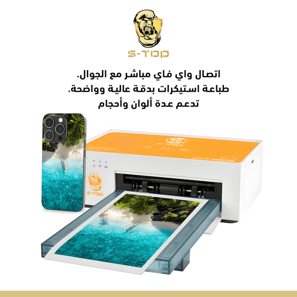 طابعة S-TOP هي الحل الأمثل لطباعة الملصقات بسهولة وسرعة مباشرةً من هاتفك الذكي. تتميز بإمكانية الاتصال عبر الواي فاي، مما يسمح لك بتصميم وطباعة استيكرات بجودة عالية من دون تعقيدات الكابلات، وهي مثالية للاستخدام الشخصي أو للأعمال التجارية الصغيرة.