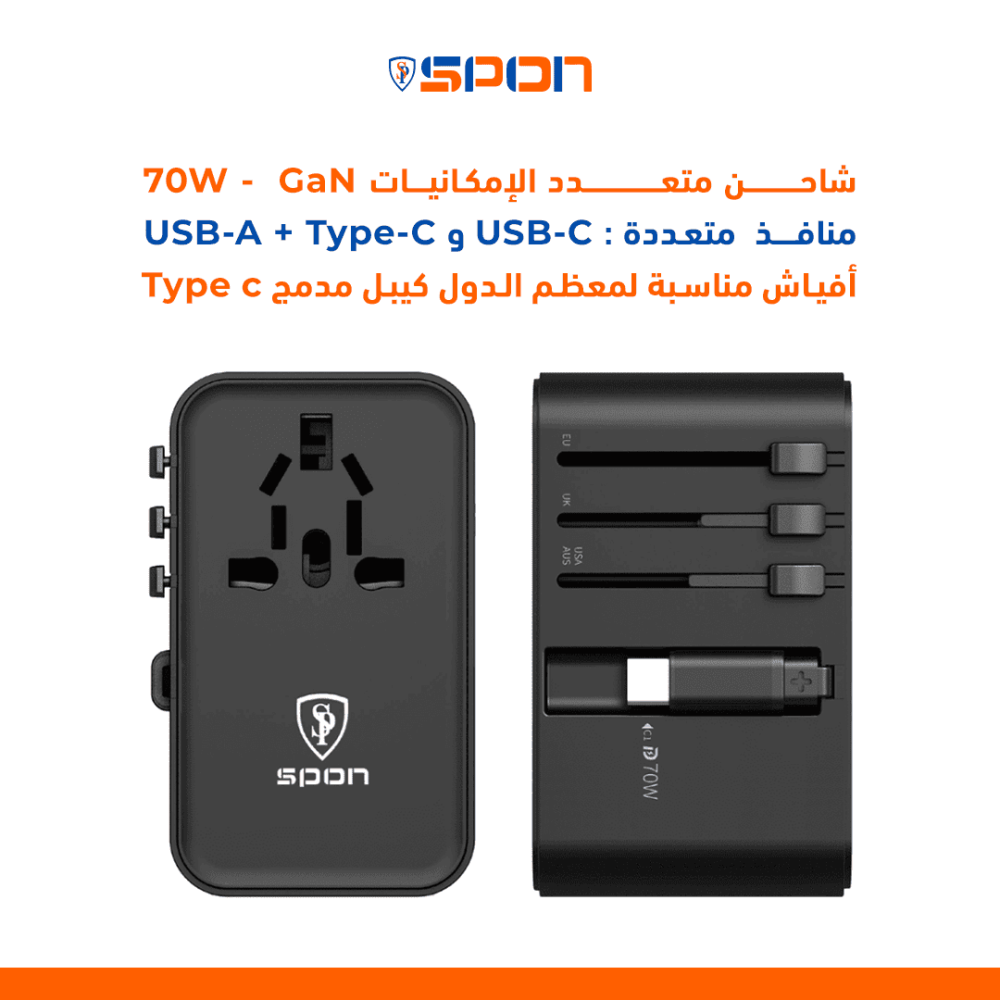 - شاحن SPON يأتي بتصميم محمول وصغير الحجم للغاية بنسبة 60% مقارنة بأجهزة الشحن التقليدية، فهو شاحن بقدرة 70 واط يتمتع بحجم مصغر للغاية. يتميز بتصميم مدمج مصنوع من مواد عالية الجودة، مما يحافظ على المساحة ويزيد من الراحة مع سهولة الحمل المحسنة.